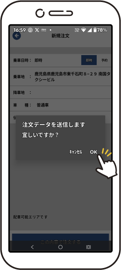 2 タクシーを呼びたい場所に+マークを合わせて「この場所を指定」をタップ